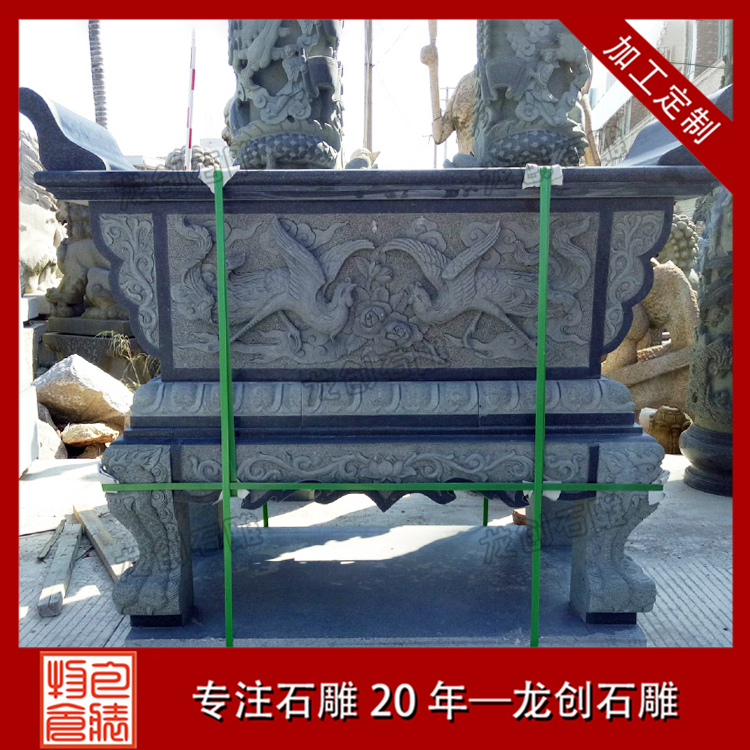 石雕香案,用來供奉神位,擺放香燭貢品來供奉神靈、牌位等的長方形桌子,常放置于于寺廟,家庭供奉神靈,牌位前。通常人們也把香案稱之為供桌,祭祀時常供設香爐、蠟竿和擺放供品,故名供桌。常與天然幾、八仙桌和兩只“獨座”,或一對扶手椅構成一組家具。
