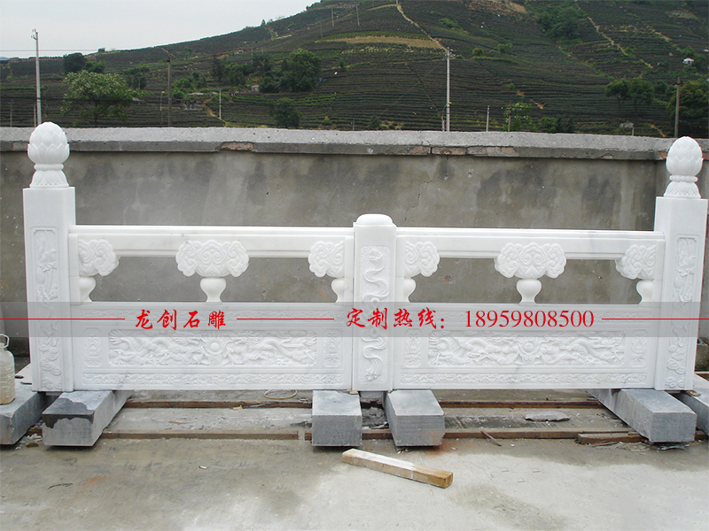 漢白玉顏色美觀,石材花紋清晰,漢白玉價格昂貴,根據(jù)不同的等級從特技漢白玉開始劃分,價格自然也不一樣,同時不同的地方生產(chǎn)的漢白玉價格也是不同的。龍創(chuàng)石雕雕刻的這款漢白玉石雕漢白玉欄桿顏色通體發(fā)白,長方體立柱上表面浮雕飛鳳,在立柱頂部是浮雕飛龍的圓柱,欄桿欄板以動物的形狀雕刻,兩只漢白玉石獅子前腳踩在一顆石球上,背上各有一只小獅子,這款欄桿雕刻了多種吉祥寓意的動物,雕刻工藝復雜,寓意豐富,適合高檔場所使用。