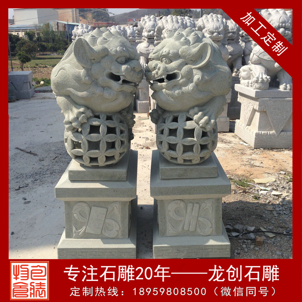 石獅子的造型一般尊嚴而又大氣,是皇jia守衛門戶確保皇宮安寧的瑞獸,因為獅子是獸中zhi王,它體態壯碩雄健、威錳無比、氣勢非常。統治者認為獅子不但可以避邪,還可帶來祥瑞之氣。石雕北京獅為雌雄一對,獅頭飾鬃髦,頸懸響鈴,肌肉發達,氣勢雄偉。雌獅前左腳下有一幼獅仰臥作嬉戲狀,雄獅前右腳撫踩一繡球。底座有繁縟精致的卷葉紋。石雕北京獅瑞獸一種,百獸zhi王,勇不可擋,威震四方,不但可以避邪,且可帶來祥瑞之氣,能解除多種形煞,亦加強官威或屋主之陽氣,如果窗口見到不利之沖克,如沖煞、天斬煞等,可放一對石獅面向口可化煞,且有生權之意,適合官職人員擺放,古時衙門前就是擺放獅子鎮守。